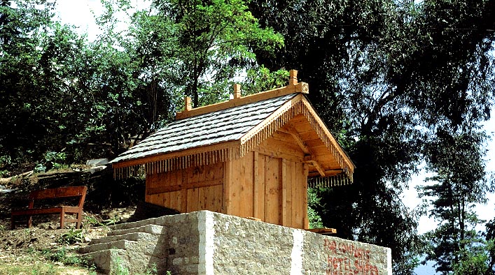 日本の神社建築の原形のような、木造の小祠堂、ナガル