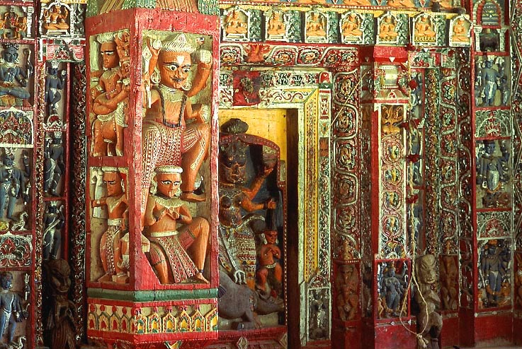 極彩色に塗装されたドゥルガー寺院の マンダパ内部、マナン