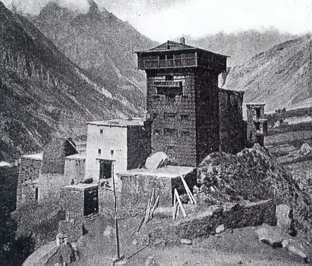 ゴンドラーの町の 古い要塞を鳥瞰する。 かつては周囲に低層部があったが、すべて失われてしまった。 (参考) 1912年当時の ゴンドラーの要塞 (From C.G. Bruce : Kulu and Lahoul, 1914, London)