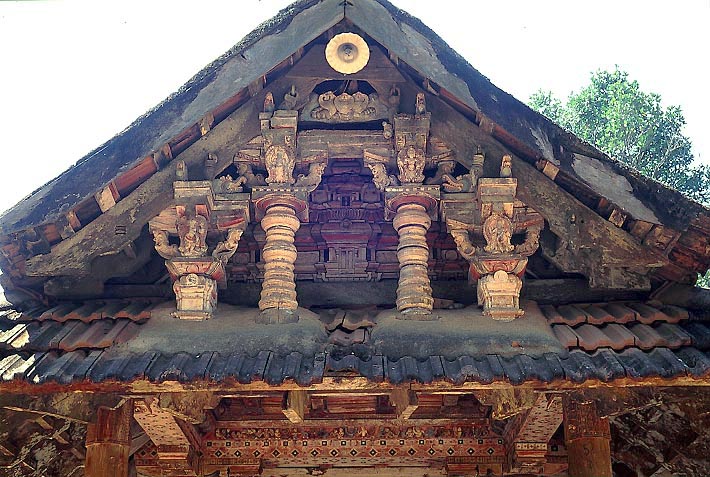 過剰とも言えるほどの木彫で妻部が飾られ 彩色されるのが、ケーララ建築の特徴である。