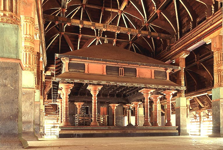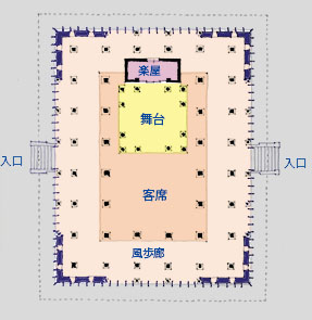 日本の能楽堂のように、屋根のついた木造の定型舞台が設けられている。