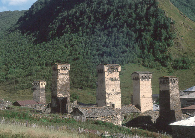 スワネティ地方のウシュグリ村には 多くの集落があり、塔状住居が林立している。