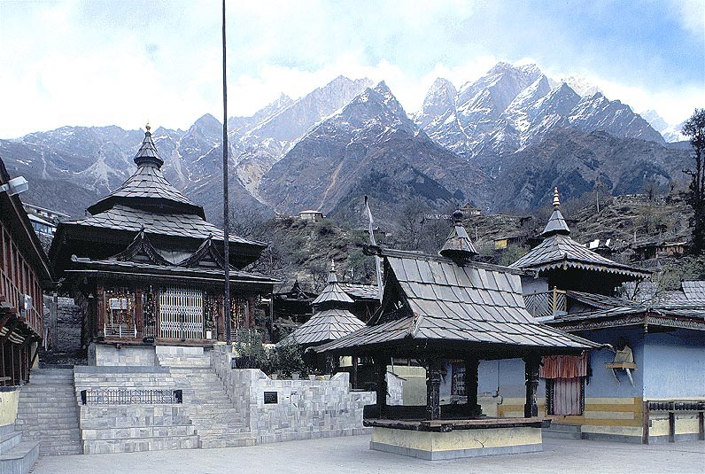4,000m級の雪山を背景にした木造のヒンドゥ寺院、サングラー村