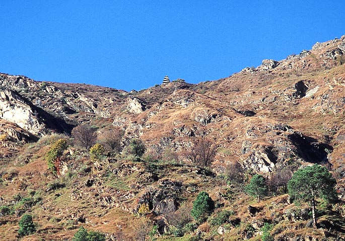A five storied temple is seen on the top of a mountain, Shainshal.