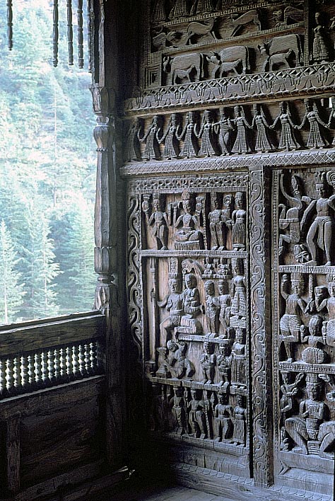 谷に面した広間の壁面に施された木彫、コトカイの城郭