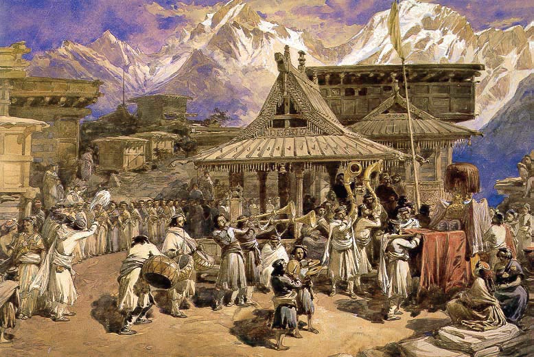 チニ(現カルパ)の近く、コティの寺院の祭礼風景、ウィリアム・シンプスン画、1860年 (From "Visions of India" by Mildred Archer, 1986, Phaidon, London)
