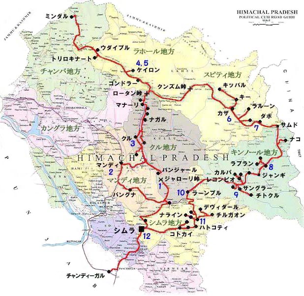 2001年 9月の旅程を記した ヒマーチャル・プラデシュ州の地図