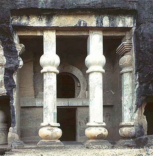 ブータ・レーナ窟(No.26)のファサード、ジュンナール(インド) 4本柱と梁のフレームから成る ファサードの奥の壁に、チャイティヤ窓がある。 アジャンター石窟寺院群、第26窟 柱と梁状の四角いフレームのファサードの中に チャイティヤ窓がある。