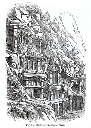 ミュラのネクロポリスの摩崖墓群、前4〜前3世紀 (ヴィルヘルム・リュプケの『美術史概説』の挿図 75) (From Wilhelm Lübke, Outlines of the History of Art, 1904, New York )