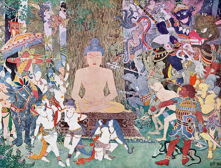 伊東忠太の彩色画 『釈迦降魔相』(降魔成道の釈迦) 『伊東忠太建築作品』(1941、城南書院)の口絵 この絵が描かれた時期は記載されていないが、晩年に出版された作品集の、唯一のカラー口絵に 選んだくらいだから、本人も編集者も、これを忠太の絵画の最高作品と見なしたのであろう。 忠太のインドへの思い入れの強さと、妖怪や魑魅魍魎(ちみ もうりょう)への愛着を よく示している。 (この絵は『伊東忠太建築文献』第6巻「論叢・随想・漫筆」の巻のカラー口絵にも掲げられている。)