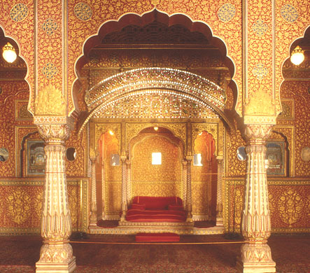 (左)ジュナーガル城内、インド・サラセン様式の アーヌープ宮殿内部、ビーカーネル (インド)