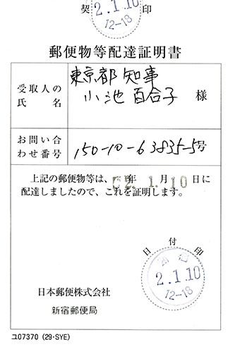 被告1東京都知事への手紙の配達証明(2020年1月10日配達)