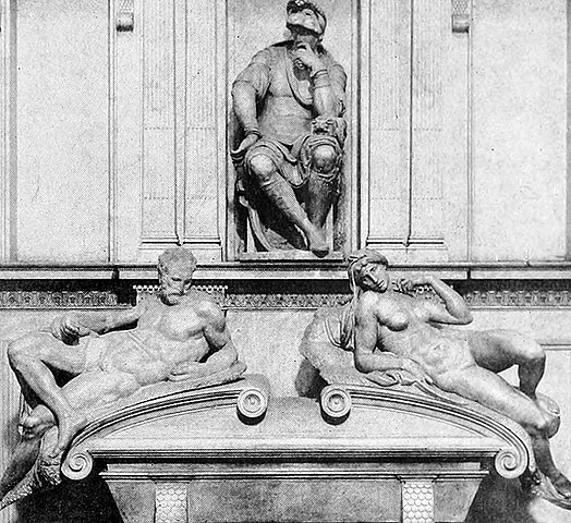 ロレンツォの像の下に、「夕べ」と「朝」の彫刻が左右に侍(はべ)っている。
