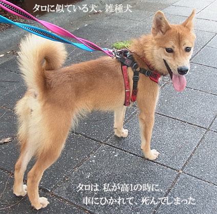 とはいえ、タロは 不慮の死を 遂げました。私が 高校1年生の時でしたが、学校へ行っている間に、古くなった首輪が ゆるくなって はずれたのでしょう、タロは 外へ飛び出して行って、車に轢かれてしまったのです。即死だったそうです。うちには 車が無かったので、タロは 自動車に慣れていなかったし、高齢になって、運動神経が鈍っていた かもしれません。犬や猫は、走るものに興味を持って 後を追いかけて行く癖があります。そうやって 車に轢かれて死んだ 犬や猫は 多かったのです。「動物愛護法」ができる前には、車は みな「ひき逃げ」です。兄と二人で、庭の、池のうしろに埋めて 築山を作り、お墓にしたことを 覚えています。 タロと似た犬の写真を ネットで探していた時、ふと アマゾンで「雑種犬」に関する本を調べてみたら、あまり無いですが、『雑種犬 タロー ストーリー』という本が あるのを見つけて 驚きました。タロと同じ名前の雑種犬がいたのです。しかも 本にまでなって。 太田英恵(はなえ)さんという方が 旦那さんと共に、生まれて間もない雑種犬を買って、タローと名付けて 溺愛し、タローが 17歳まで長生きして 病気と老衰で死ぬまで、愛犬と一緒に暮らした生活や思いを綴って 自費出版されたものです。