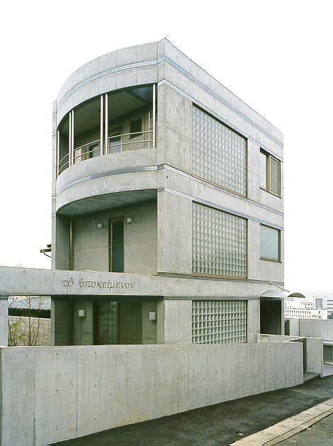 コンクリート打ち放しとガラス・ブロックで構成された外観を、東南側から見る。