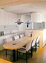 台所は、中庭を眺めながらの炊事が行えるレイアウトとされている。 北ウィングの子供室の様子をうかがうこともでき、食堂の吹き抜けを介して 2階の雰囲気も伝わってくる。家の “核” とも言うべき位置を家事空間が占めるプランは、「建主は会社経営者だが、来客重視ではなく家族の生活を第一に考えていた」(神谷氏)ことから生み出された。