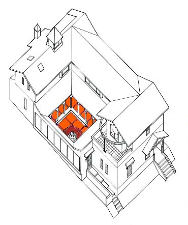 建主が、さんさんと南の光が注ぐような家を好まず、穏やかで均質な光を要求したこと、また夫人が、台所仕事などの家事が孤立することなく、絶えず子供たちと接していられるようなプランを希望したことで、今回のクロイスター(=修道院の回廊中庭)は実現した。