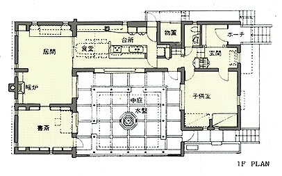 この住宅は 日本の生活様式と、ロマネスクの修道院、モロッコの パティオ形式とが 切り結ぶことによって成立した。それを可能にさせたのは、この家の主婦が 家事(特に台所仕事)を孤立させず、子供たちの活動(遊びと学習)に 絶えず接していたいという 機能的な要求、および この家の主人が 全面 南面採光の部屋を好まず、柔らかい落ち着いた光線の室内を好む、という心理的な要求であった。