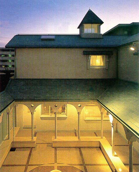 2階のテラスより中庭を見下ろす。