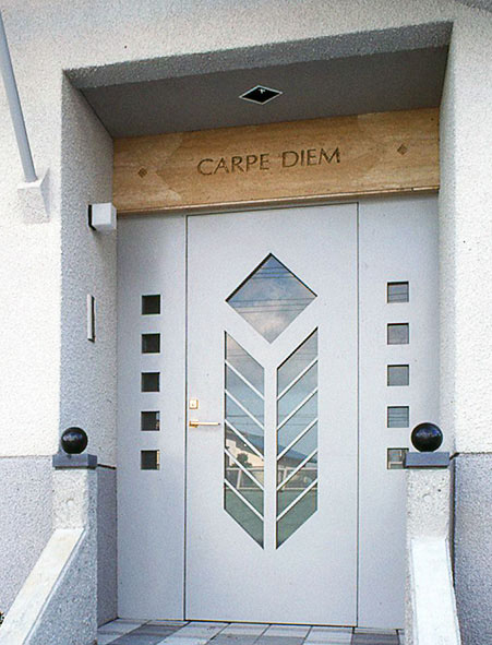 玄関上の石には ラテン語で「CARPE DIEM (カルペ・ディエム) 」 と刻んだ。 古代ローマの詩人 ホラティウスの詩句で、「その日をつかめ」とか、 (明日のことなど思い煩うよりも)「今日を楽しめ」などと訳される。 家のオーナーが「家訓」として選んだ 句