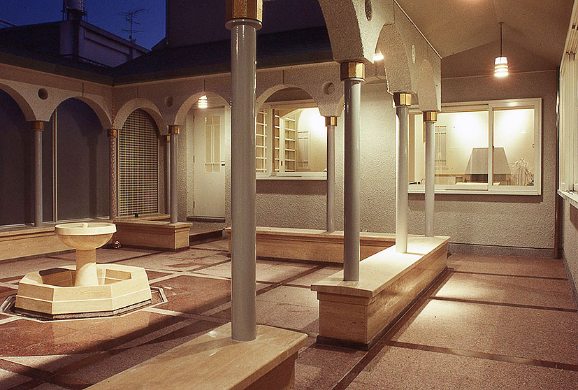 回廊で囲われた、水盤のある中庭の夜景
