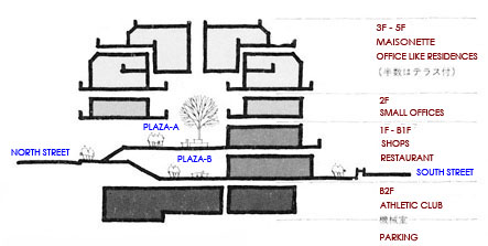 The next problem was the possibility of the change of the sitefs legal land-use restriction. A revision of the land-use zoning was being undertaken by the Capital Planning Board, and its enforcement time could be just when we would have applied for the reconfirmation of the plan to the construction law in our new schedule. I had to develop the design while checking frequently the information about the revision. In the case of a change from an exclusively residential district to a residential, the unsettled athletic club would be possible as a basement tenant, and the legally feasible underground parking area could be augmented.