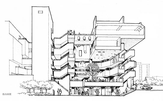 ![]() Sectional Perspective Drawing (inked on tracing paper) Thus, looking back at the design process, it can be said that the time has changed from when a building was able to be made based on a sketch, as was the Sidney Opera House by the Danish architect Jorn Utzon,. Urban life has been steadily becoming more complicated, the intricacy of function and mechanical equipment augments endlessly, issues of insolation disturbance and so on, based on urban overcrowding, occur more often, checks of proficiency and legal regulations grow more and more strict, and the number of stake holders increases the more difficult a building design becomes. The esquisse of legal restrictions is rather more severe than that of building form and space. If the legal regulations had been applied to the From First Building more strictly to our disadvantage, this project could not have been actualized. Thinking back to the issues around the maisonette offices on the third to fifth floors, the plazas and corridors that were not included in the legal area, the exclusion of application to the econtinual shops regulationf, and other various perilous interpretations of ordinances, I admire even now our eventual actualization of the design of the From First Building. I believe, in spite of the pressures of changes in social conditions, run-of-the-mill buildings, built only to adapt to this situation, are not to societyfs wider expectation. That is, current architects should not only generate creative images and ideas but also more patience and identity to materialize them. ( November 1976, on "Kenchiku Chishiki" )