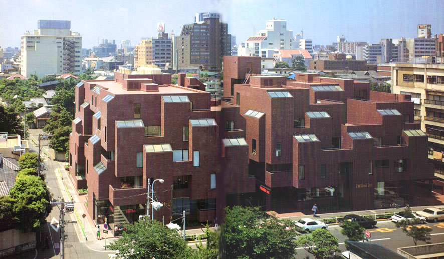 斜め向かいのビルから見た、フロム・ファースト・ビルの全景 (撮影:門馬金昭) 退屈な 真四角のビルには 絶対にしたくなかったので、多数の「部分」が 積み重なったような、複雑な形にデザインした。そのために 設計も、工事の監理も 2倍の労力を必要とし、非常に苦労した。赤茶色のレンガ調タイルで くるまれた外観は、 同じ頃に竣工した 丸の内の東京海上ビル(前川国男)とともに評判になり、 このあと10年の間に、多くのビルが 同様の仕上げ(いわゆる 煉瓦タイル)で建てられた。