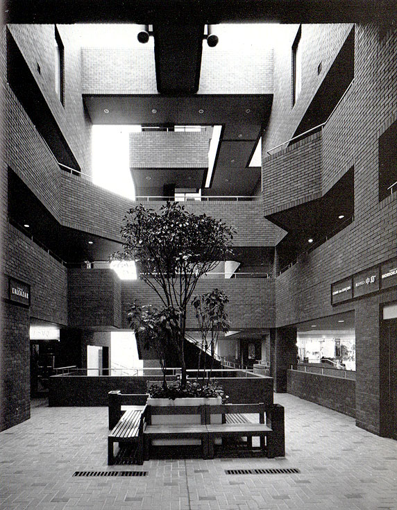 フロム・ファースト・ビルの中庭を西側から見る(撮影:門馬金昭) 外装タイルは、10×20cmの モデュール・タイルで 割り付けたので、隅々まで完全に納まった。「プラザ」には、 浜野商品研究所のデザインによる ベンチと植樹台が置かれた。