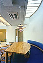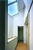 ペンチの真上は吹き抜けていて、2階の諸室と声をかわせる。 上からそっと、下の客を観察することもできる。吹き抜けの真上はトップライトとなって青空が見えるので、薄暗くなりがちな2階中廊下がたいへん明るく、さらに1階の食卓に光を投げかける。
