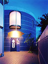 この家で外観として人が目にする唯一の場所が、玄関へのアプローチである。青紫色のタイルに、淡い色のストライプをつけた曲面壁が直線状の塀に連続し、両者にはさまれた所にライラックの樹を植えた。この樹がこの家のシンボルであるが、しかしライラックは華奢な樹で、大きな樹にはならない。