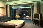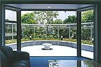 居間からは、このパティオの眺めを最大限楽しむべく、正面に大ガラスを嵌め、その左右を開きガラス戸として庭との一体化をはかった。
