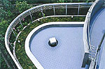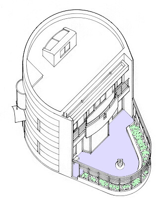 建物本体は円筒を南側で切断した形となるが、この切断部を延長して敷地の形にあわせ、アルミのスクリーンを半円形にまわすことにした。 このスクリーンの外側を、庭の背景となる背の高い緑とし、内側を 「囲われた庭(パティオ)」 として、イスラミックな幾何学庭園とした。