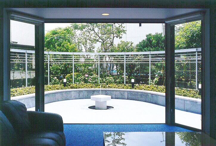 ベンチと花壇とアルミ・スクリーンで囲まれたパティオを居間から見る。