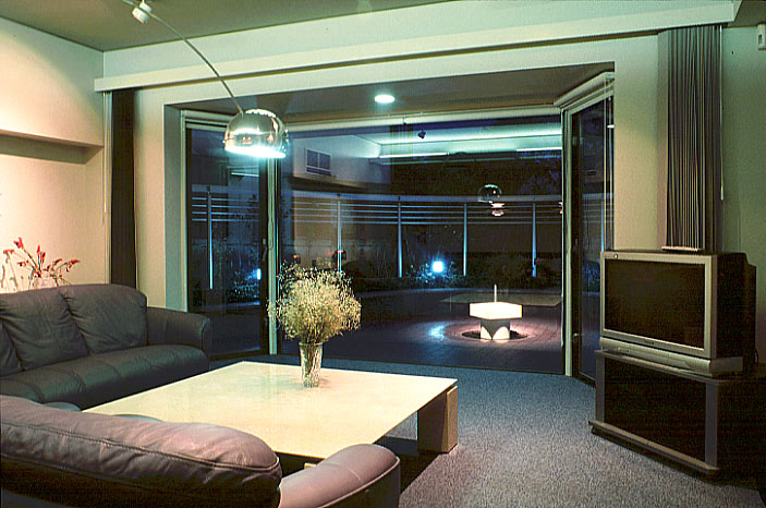 大ガラスの外にパティオの泉水がうかび上がる 居間の夜景。