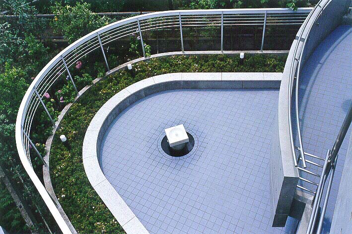 ベンチと花壇とアルミ・スクリーンで囲まれたパティオを屋上から見る。
