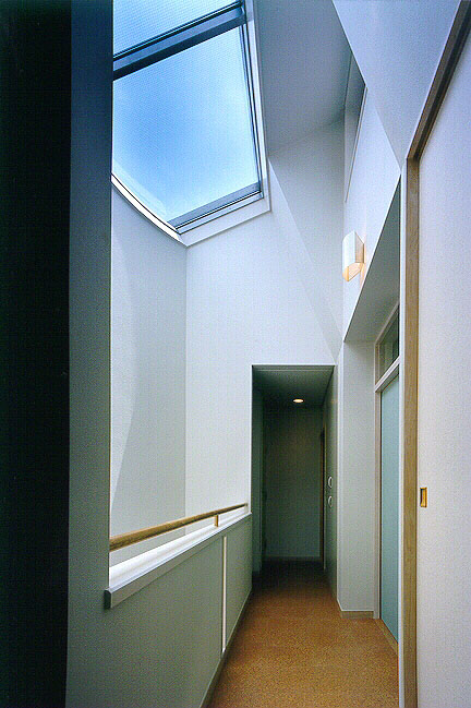 トップライトが 2階の中廊下を明るくすると共に、吹き抜けを通して1階の食堂に光を落とす。