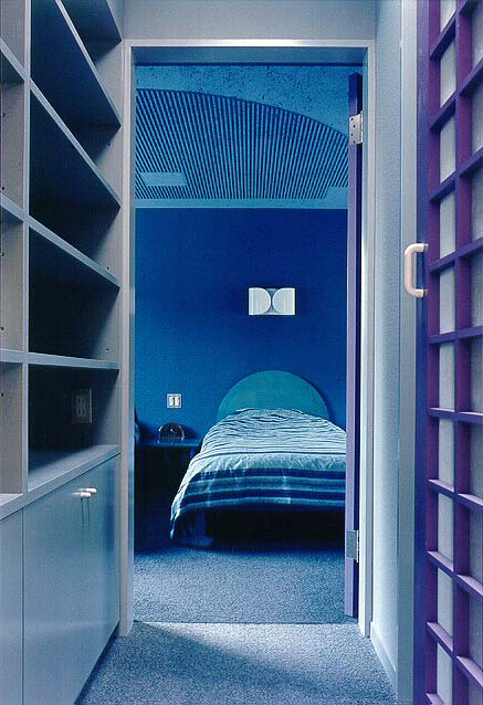 白く仕上げられた広間とは対照的に、奥の寝室は海の底のように青い色を主調としている。