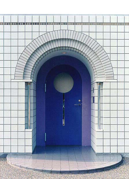 アーチ状のエントランス・ポーチと、紫色に塗装された玄関ドア