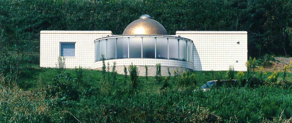 外観の全景。 すりガラスの塀の上に、金色のタイルが貼られた広間のドーム屋根が見える。