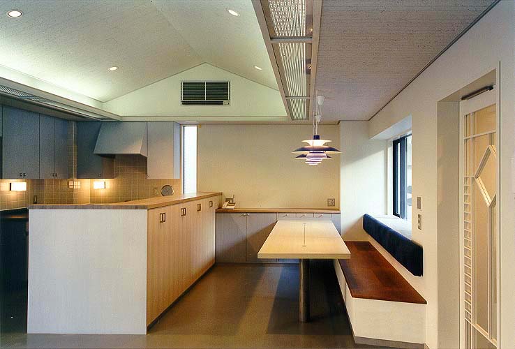 4階住居の食堂とオープン・キッチン。 ベンチの後ろ側に中庭があり、南の陽がさす。