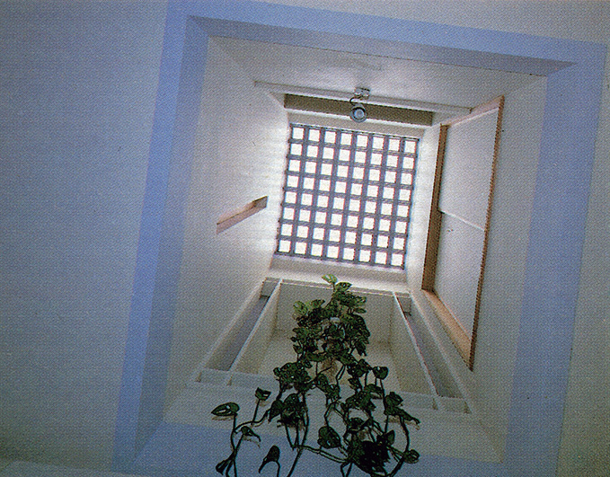 The floor of the clothe-drying space on the 3rd floor is made of glass blocks to light the 2nd floor corridor and the 1st floor dining.