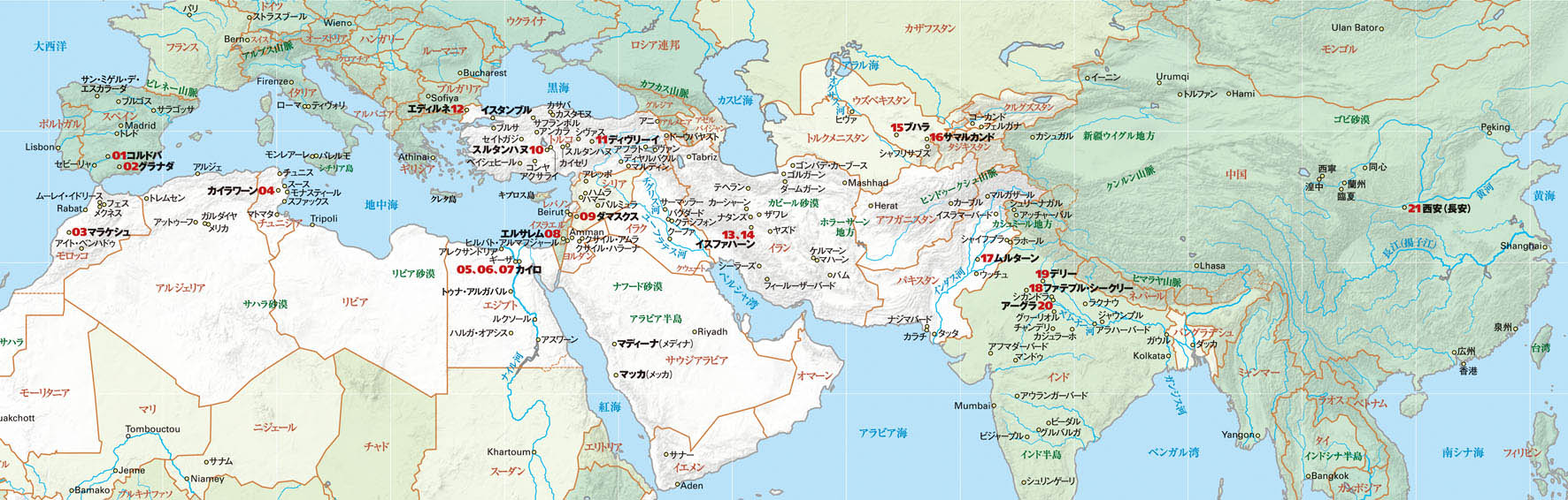 『イスラーム建築、その魅力と特質』の第1章に添えられた イスラーム建築地図。(制作:ジェイ・マップ) 本文中に出てくる地名をすべて記し、赤数字の番号は「イスラーム建築の名作」21点の所在地を示す。 番号は、単に地図上の位置を示すだけでなく、第2章以下における、本文の説明となる作品を、 すぐに参照できるようにするためのものでもある。 国の色分けは、人口に対する ムスリム(イスラーム教徒)の比率を示す。(白い国ほど 比率が高い)