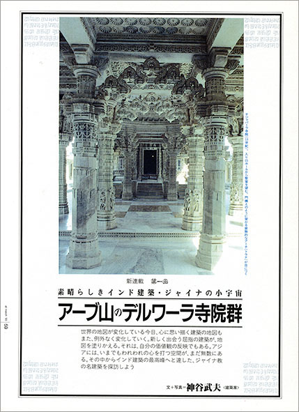 1993年5月号〜1994年8月号、「 素晴らしきインド建築 」 ● 建築雑誌『 at 』の「懸賞論文」で優秀賞を取って親しくなった編集部から、インド建築についての連載を依頼されました。 1993年5月号からの1年間の隔月連載で、ジャイナ教の建築について書くことにしま した。 日本で ほとんどまったく知られていない ジャイナ教の宗教と建築について、どのような順序で書くか、熟考を要しました。編集担当は、 連載前半が白鳥さんで、後半が土田さんでした。