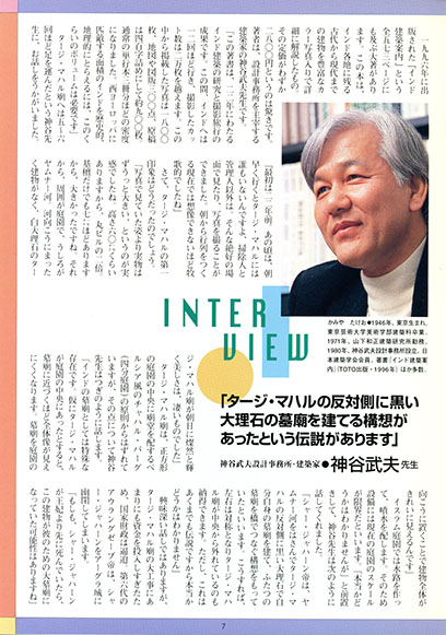 建築家 神谷武夫 先生 1996年に出版された『インド建築案内』という、全573ページにも及ぶ大著があります。この本は インド各地に残る 古代から現代までの建物を 豊富なカラー写真入りで詳細に解説したもの。その定価が わずか 2,800円というのは驚きです。著者は、設計事務所を主宰する建築家の 神谷武夫先生です。 「この著書は 22年にわたるインド建築の研究と 撮影旅行の成果です。この間、インドへは 12回ほど行き、撮影したカット数は2万枚を超えます。この中から掲載した写真は 1,800枚、地図や図面 300点、原稿は400字詰めにして約 900枚、通常の単行本3冊分ほどの密度になりました。西ヨーロッパに匹敵する面積のインドを 歴史的、地理的にとらえるには、このくらいのボリュームは必要です」 タージ・マハル廟へは 5〜6回ほど足を運んだという神谷先生に、お話しをうかがいました。 「最初は 22年前、あの頃は 朝早く行くと タージ・マハルには誰もいないんですよ、掃除人と管理人以外は。そんな絶好の場面で見たり、写真を撮ることができました。朝から行列をつくる 現在では 想像できないほど 牧歌的でしたね」 さて、タージ・マハルの第一印象は どうだったのでしょう。 「写真で見ていた姿より 実物は ずぅっと大きい、というのが実感でしたね。高さ 60メートルくらいありますから、丸ビルの2倍。基壇だけでも7メートルほどありますから、大きかったですね。それから、周囲が庭園で、うしろがヤムナー河、川向こうにまったく建物がなく、白大理石のタージ・マハル廟が 朝日に燦然と輝く美しさは、凄いものでした」 タージ・マハル廟は、正方形の庭園の中央に廟を配する ペルシア風のチャハル・バーグ(四分庭園)の原則から はずれていますが、その点について 神谷先生はつぎのように話します。 「インドの墓廟としては 特殊な存在です。仮に タージ・マハルが庭園の中央にあったとすると、募廟に近づくほど 全体像が見えにくくなります。募廟を庭園の向こうに置くことで 建物全体がきれいに見えるんです」 イスラム庭園では 水路を作って噴水を配します。そのため設備には 現在の庭園のスケールが限界だといいます。「本当かどうかは わかりませんが」と前置きして、神谷先生は 次のように話してくれました。 「シャー・ジャハン帝は、ヤムナー河をはさんで タージ・マハルの反対側に 黒い大理石で 自分自身の募廟を建て、ふたつの募廟を 橋でつなぐ構想をもっていたと いいます。こうすれば 左右は対称となり、タージ・マハル廟が 中央から外れているのも 納得できます。ただし、これは あくまでも伝説ですから 本当かどうかは わかりません」 興味深い話ではありますが、タージ・マハル廟の大工事に あまりにも資金を投入しすぎたため、国家財政は逼迫。第6代のアウラングゼーブ帝は、シャー・ジャハーンを アーグラ城に幽閉してしまいます。 「もしも、シャー・ジャハーンが 王妃よりも先に死んでいたら、この建物が 彼のための大募廟になっていた可能性は ありますね」