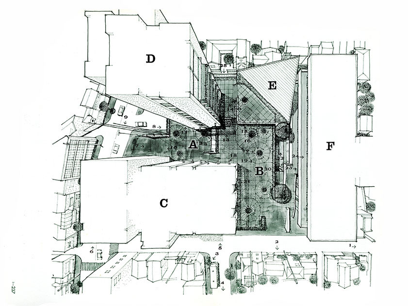 『 新建築 』 1972年1月号、237ページ A:エスプラナード No.1 C:大ホール(1,500席) D:事務所塔(7F) B:エスプラナード No.2 E:小ホール(500席) F:県立図書館(既存)