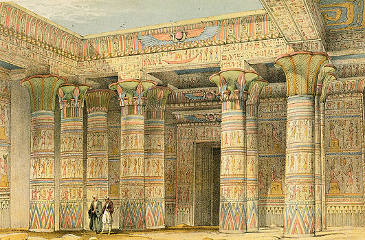 まず 扉の向かいのフロンティスピース(口絵)は、ナポレオンによる『エジプト誌』の図版をもとにしたものですが、エジプトのフィラエ神殿を描いた彩色石版画なので、本全体に華やかな印象を もたらしました。これはフランシス・アランデイル(1807-53)の原画を 当時隆盛だったマイケルとニコラス(兄弟?)・ハンハートのリトグラフ工房の制作になるもので、彼らが得意とした三色刷りの クロモ・リトグラフです。この書が出版された2年後の 1851年がロンドンで開催された第1回万博の年で、クロモ・リトグラフの最盛期でしたが、多色刷り石版画を挿入するのは当然高価なので、このフロンティスピース1点だけでした。