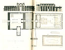 書物に挿入する図版としては、石版画が盛んになる以前は、銅版画が一般的でした。この『歴史的探究』にも5点の腐食銅版画(エッチング)が挿入されていて、その内2点は、2ページ見開きの大型版画です(27cm×36cm、エジプト、テーベの カルナック大神殿 と、ギザのピラミッドの内部構成図)、1ページ大の銅版画は、ペルセポリスの平面図、フィガリアのアポロ神殿、そしてローマのコロセウムの3点です。