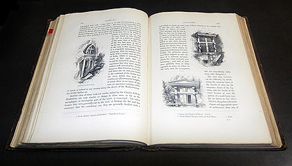 この歴史書を、ジョン・マリーの勧めを受け入れて地理的順序で書き直した『図説・建築ハンドブック』では、すべての図版を木口木版に統一して、上下巻あわせて 800点以上もの図版を入れた 画期的な本となりますが、この『歴史的探究』は、まだ図版制作の過渡期の書物で、銅版画(エッチング)と石版画(リトグラフ)と木版画(ウッドカット)を共存させています。