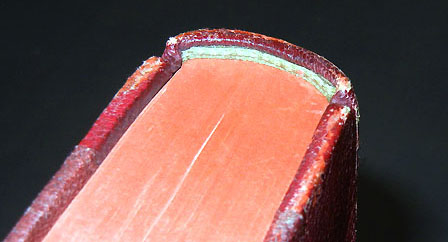 背の上下には花切れを入れ、モロッコ革の背を寝かせて被せている。